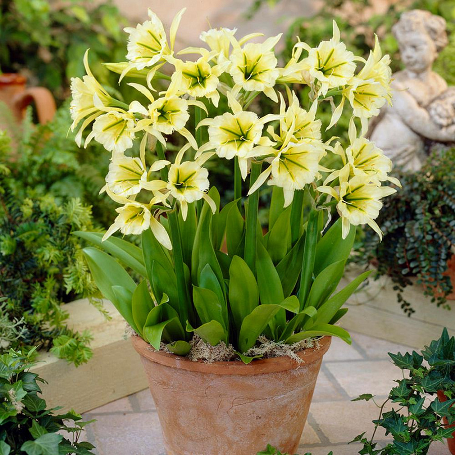 Луковицы исмены фесталис Сульфур Квин (Ismene Festalis Sulphur Queen) вырастают очень декоративными растениями, радующими взгляд оригинальными цветами-коронами. Высота многолетника до 40 сантиметров, но он заметен издалека. Длинные, сочно-зеленые лепестки закручиваются изящными спиралями, а крупные бутоны бело-желтой окраски становятся истинным украшением клумбы. Растения эффектны в групповых посадках в качестве ярких акцентов, хорошо смотрятся и в одиночных. Любят солнечное местоположение, тепло, умеренный полив. Почвы предпочтительнее рыхлые. Цветет в мае.