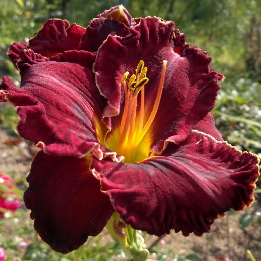- невосприимчивость семян к бактериям. Цветущее растение представляет собой раскидистый куст с высокими цветоносами и крупными бутонами темно-фиолетового оттенка. Контраст темным лепесткам и практически черному глазку создает сочное лимонное горлышко. Лепестки имеют гофрированные края и тонкую кайму белого цвета. Первое цветение лилейника Пурплликоус можно наблюдать уже в июле месяце.