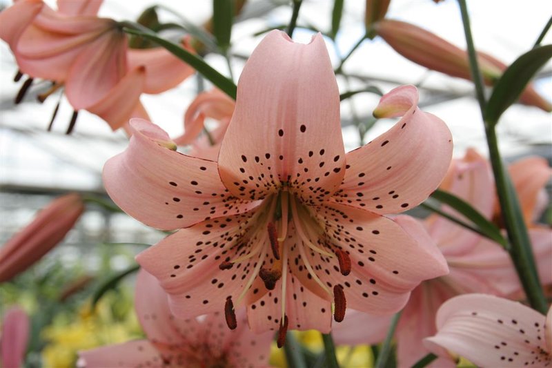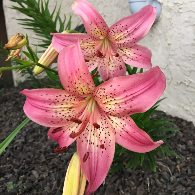 Окраска цветка : палево-розовый с крупным, частым темно-розовым крапом, лепестки подкручены вниз