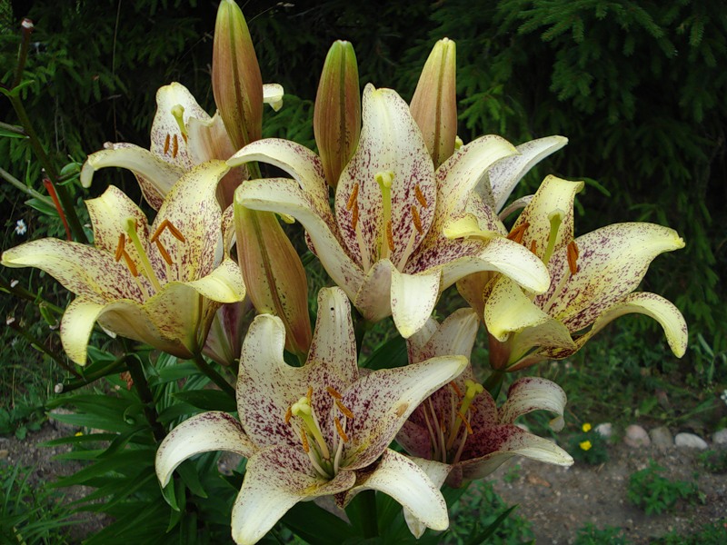 Соцветия этого растения порадуют садовода в июле месяце. Диаметр цветков до 19 см. Они очень декоративны – яркого, песочно-желтого окраса со сгущенным крапом коричнево-фиолетового цвета, разбросанного по всему лепестку.