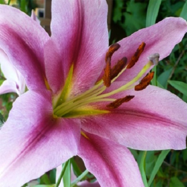Окраска цветка : цветок сиренево-розовый с малиновой полосой по центру и зеленоватым зевом