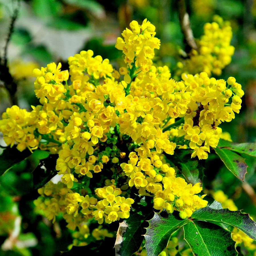 Саженцы магонии падуболистной относятся к тем вечнозеленым кустарникам, которые могут прятаться под покровом снега, и уже с первой оттепелью радовать появлением зелени. Листья у кустарника плотные и кожистые, темно-зеленого цвета. В конце мая появляются пышные соцветия желтых цветков.