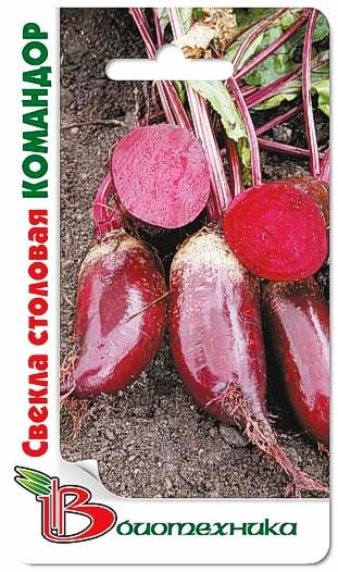 Семена свеклы "Командор" (Komandor) – это среднепоздний сорт. Период от появления первых всходов до начала сбора урожая составляет 115-130 дней. Корнеплоды имеют вытянутую, цилиндрическую форму. Кожура тонкая, темно-красная. Средняя масса варьируется от 250 до 340 грамм. Мякоть насыщенно-красного цвета, сочная и нежная, со слабой кольцеватостью. Вкусовые качества корнеплодов отличные. Товарная урожайность составляет 4-6 кг с 1 кв. м. Сорт устойчив к цветушности и отличается хорошей лежкостью. Рекомендуется для использования в кулинарии, переработки, зимнего хранения.